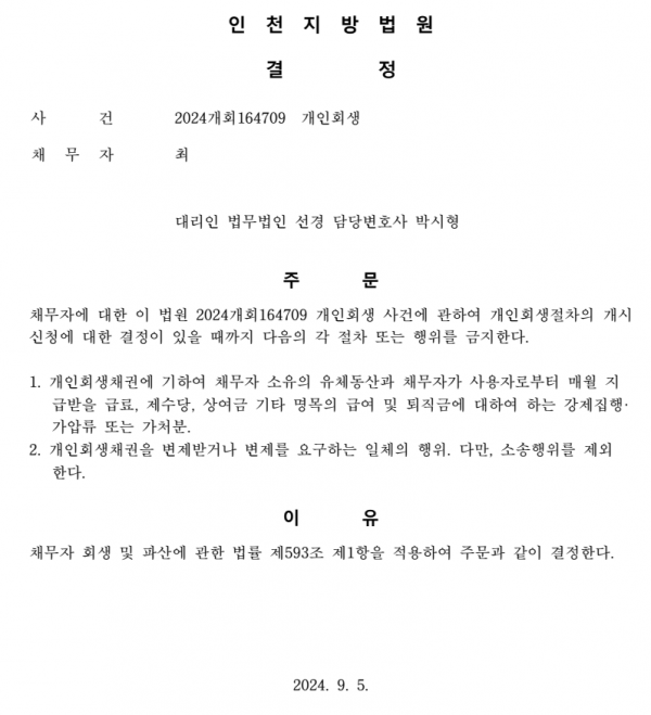개인회생신청사건의 금지명령결정문