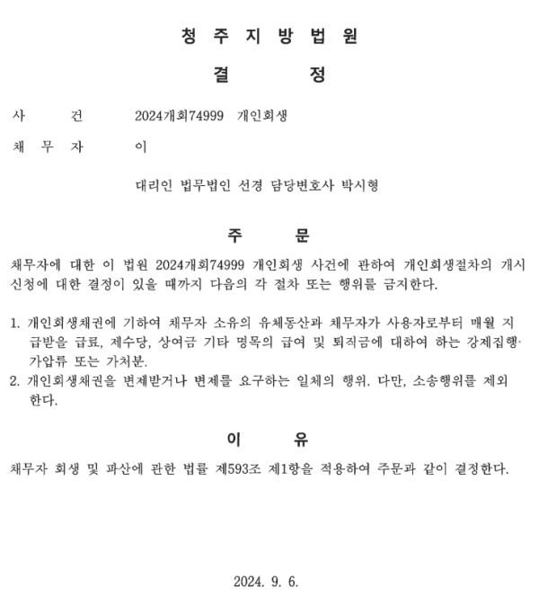 개인회생신청사건의 금지명령결정문