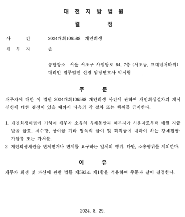 개인회생신청사건의 금지명령결정문