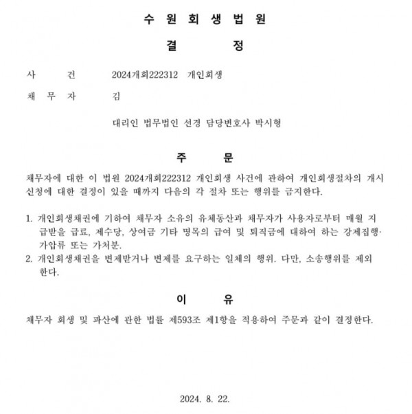 개인회생신청사건의 금지명령결정문