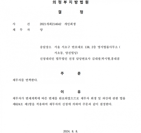 개인회생신청사건의 면책 결정문