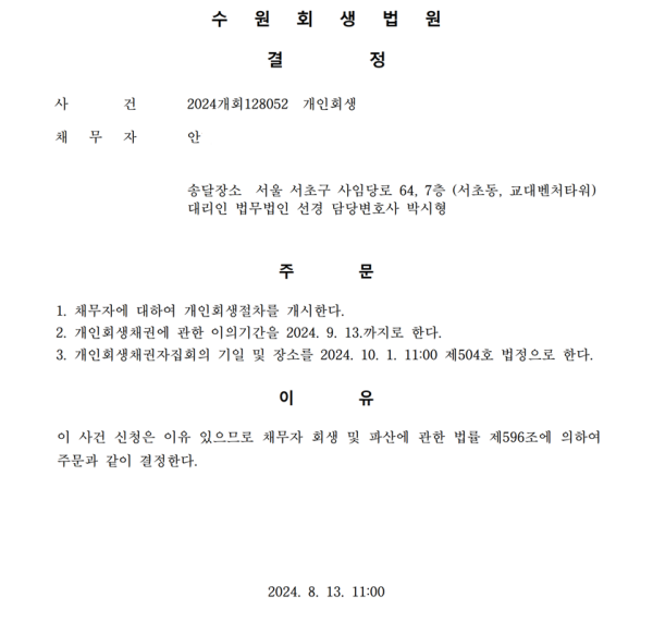 개인회생신청사건의 개시결정문