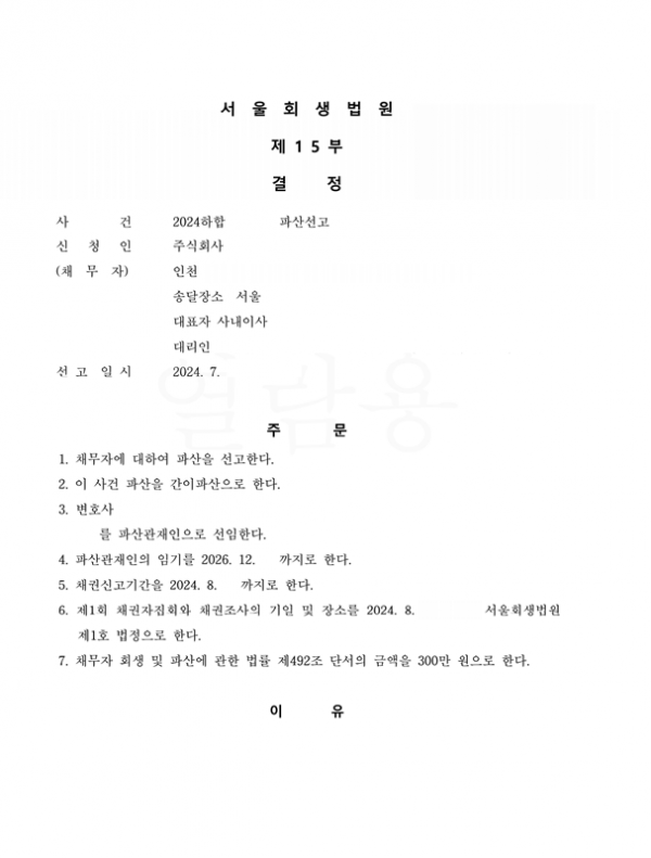 2024. 7 서울회생법원 법인파산 신청사건의 파산선고결정문