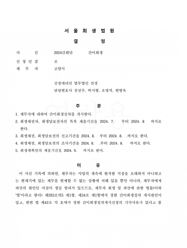 2024. 7 서울회생법원 일반회생(간이) 신청사건의 개시결정문