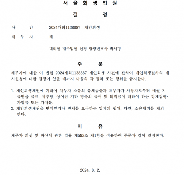 개인회생신청사건의 금지명령결정문