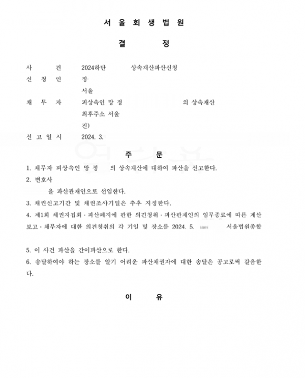 2024. 3 서울회생법원 상속재산파산 신청사건의 파산선고결정문