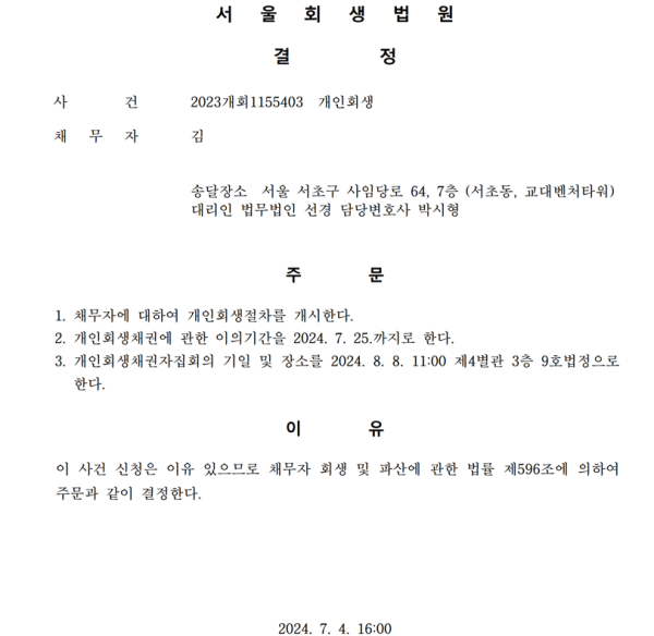 개인회생신청사건의 개시결정문