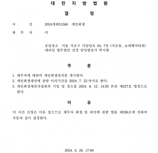개인회생신청사건의 개시결정문