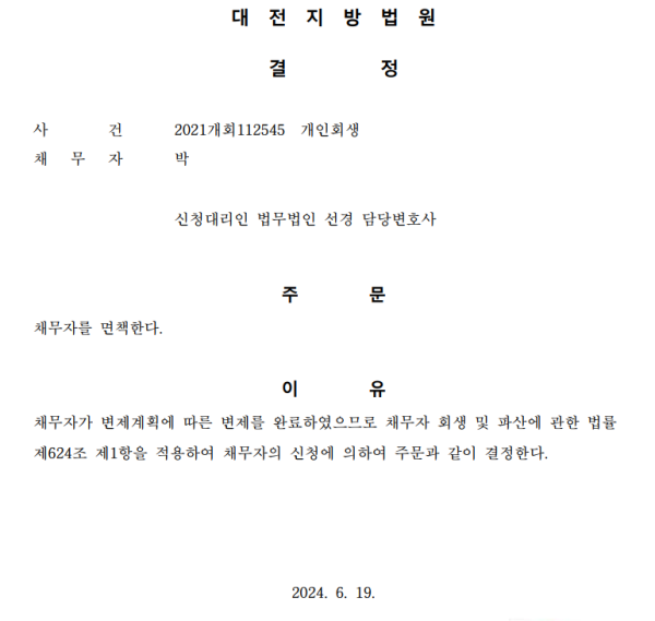 개인회생신청사건의 면책 결정문