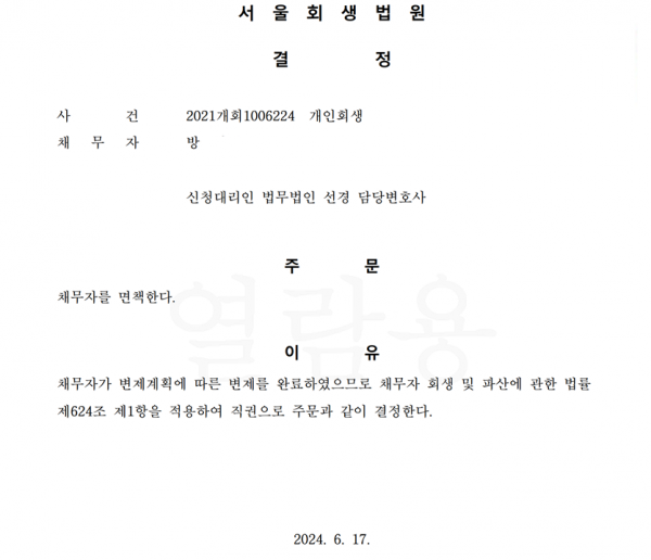 개인회생신청사건의 면책 결정문