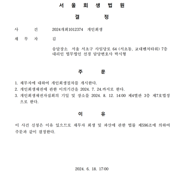 개인회생 개시결정 페이지 정보 최고관리자 작성일24-06-25 목록 본문 개인회생 개시결정2024. 6.서울회생법원개인회생신청사건의 개시결정문변제율 원금 75.73% 변제기간 38개월 목록