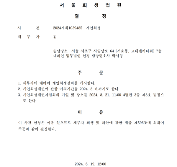 개인회생 개시결정 페이지 정보 최고관리자 작성일24-06-25 목록 본문 개인회생 개시결정2024. 6.서울회생법원개인회생신청사건의 개시결정문변제율 원금 19.80% 변제기간 36개월 목록