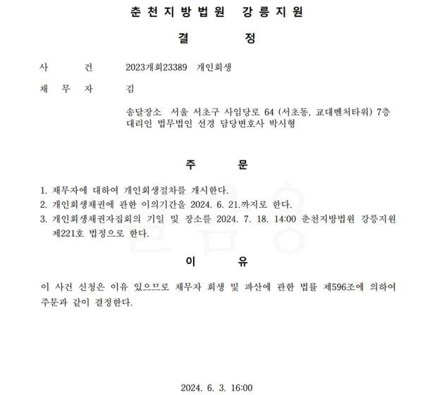 개인회생신청사건의 개시결정문