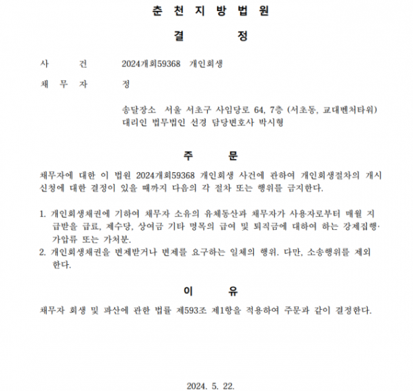 개인회생신청사건의 금지명령결정문