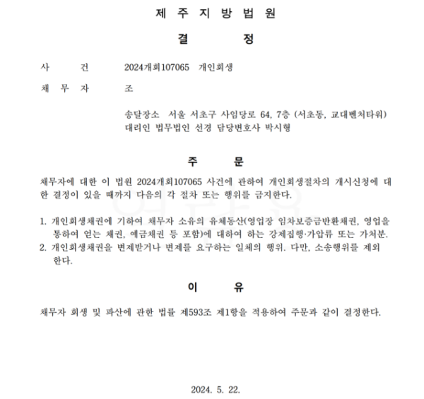 개인회생신청사건의 금지명령결정문