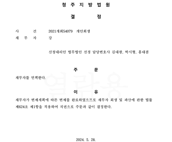 개인회생신청사건의 면책 결정문