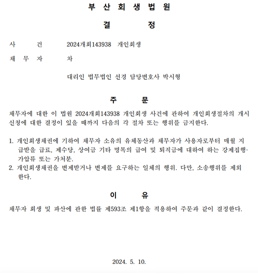 개인회생신청사건의 금지명령결정문