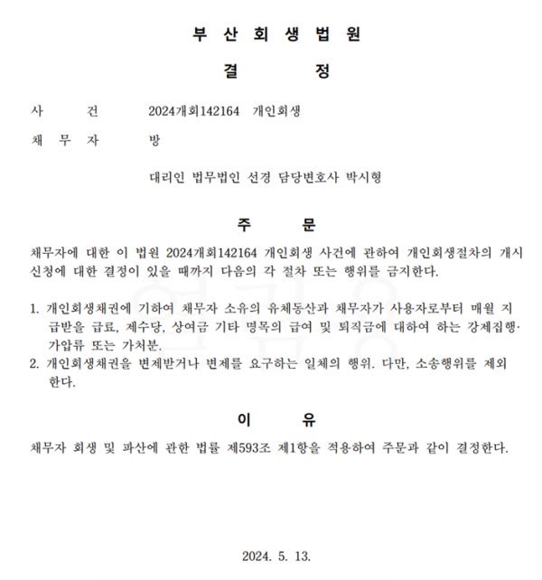 개인회생신청사건의 금지명령결정문