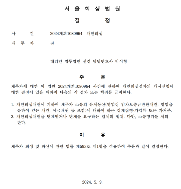 개인회생신청사건의 금지명령결정문