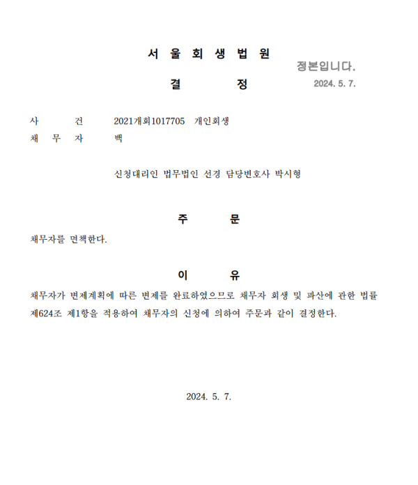 개인회생신청사건의 면책결정문