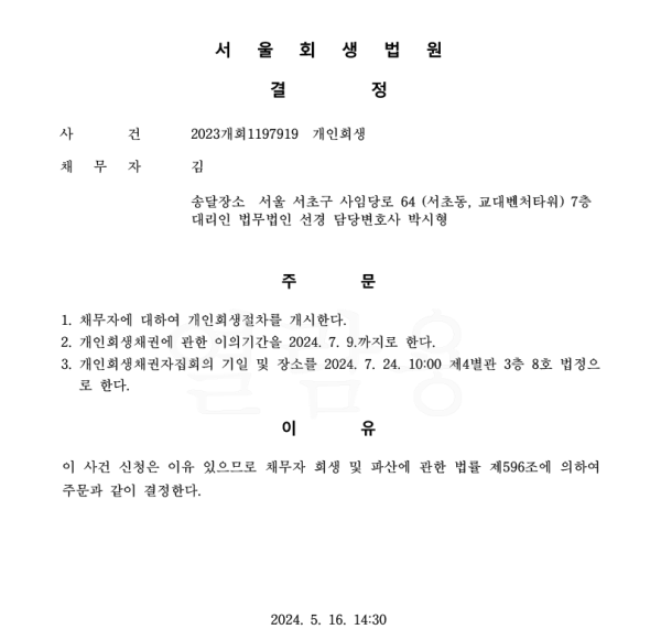 개인회생신청사건의 개시결정문