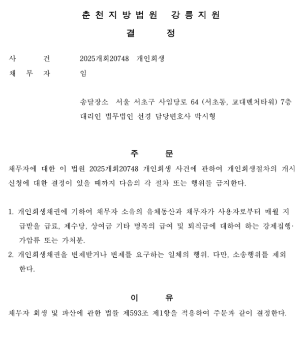 개인회생신청사건의 금지명령 결정문