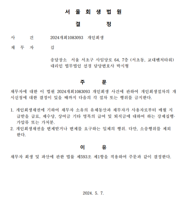 개인회생신청사건의 금지명령결정문