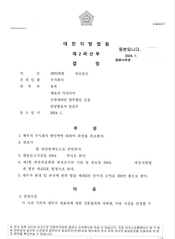 2024. 1. 대전지방법원 법인파산 신청사건의 파산선고결정문