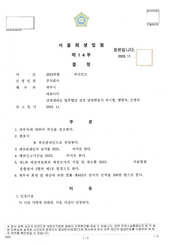 2023. 11. 서울회생법원 법인파산 신청사건의 파산선고결정문