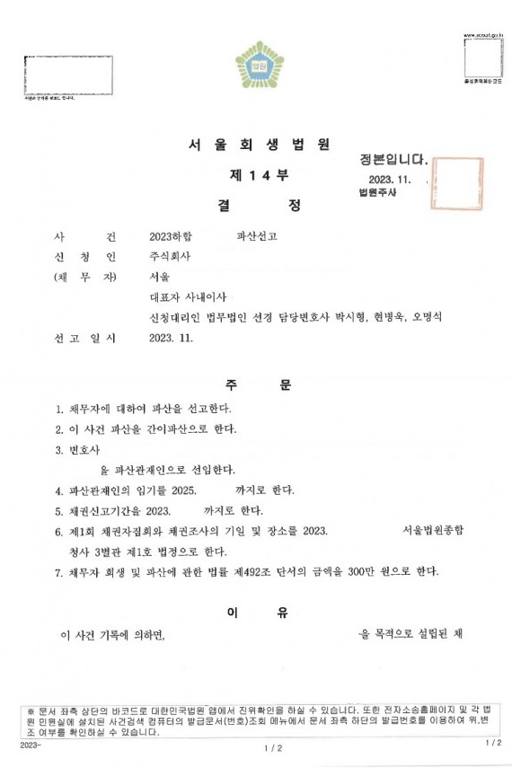 2023. 11. 서울회생법원 법인파산 신청사건의 파산선고결정문