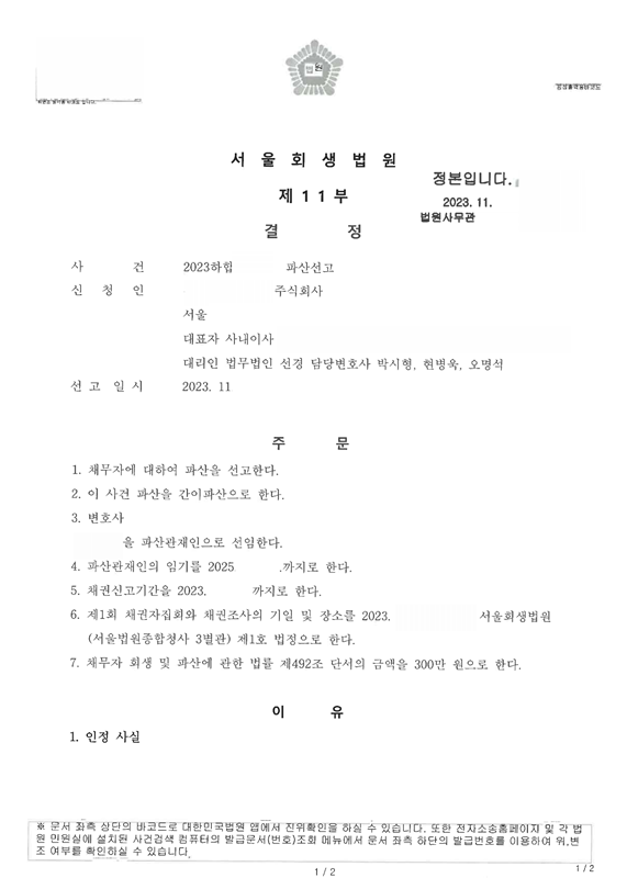 2023. 11. 서울회생법원 법인파산 신청사건의 파산선고결정문