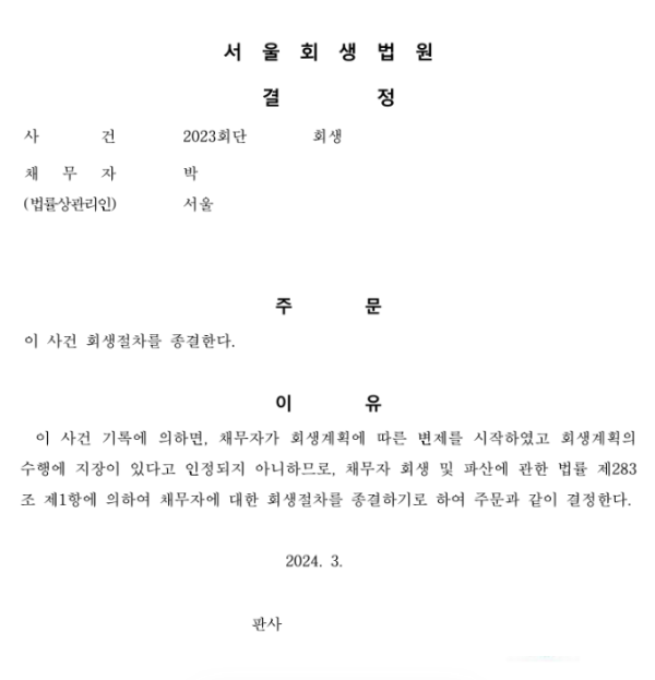 서울회생법원 일반회생 신청사건의 조기종결결정문