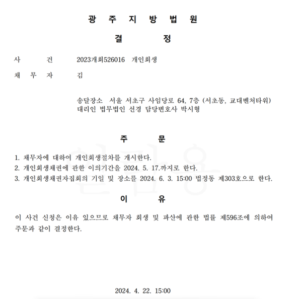 개인회생신청사건의 개시결정문