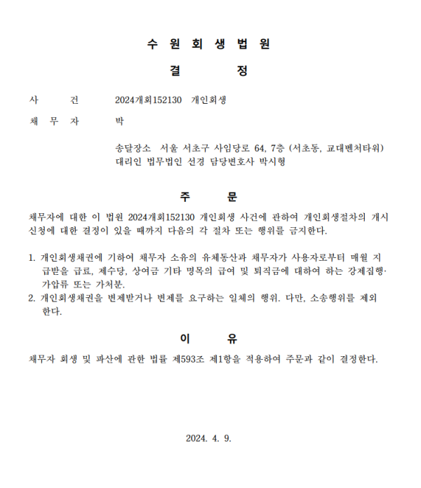 개인회생신청사건의 금지명령결정문