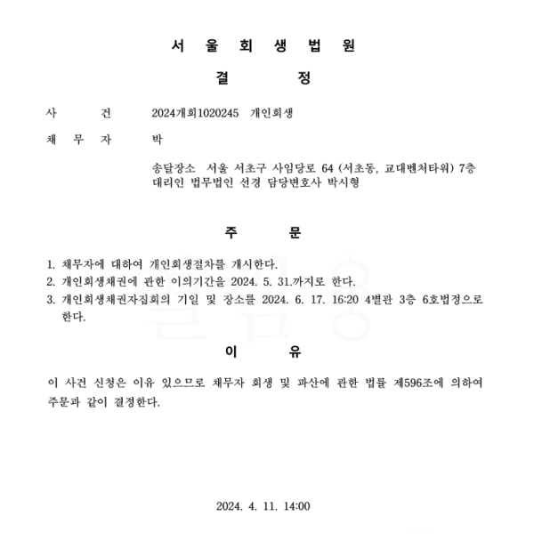 개인회생신청사건의 개시결정문