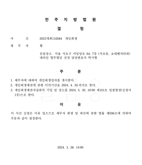 개인회생신청사건의 개시결정문