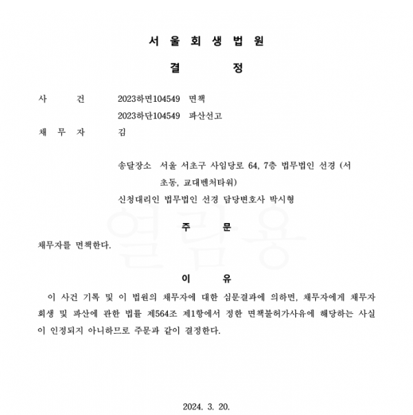 개인파산신청사건의 면책 결정문