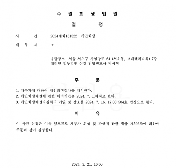 개인회생신청사건의 개시결정문