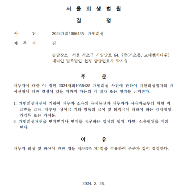 개인회생신청사건의 금지명령결정문