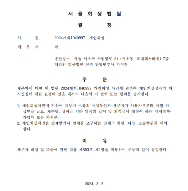 개인회생신청사건의 금지명령결정문