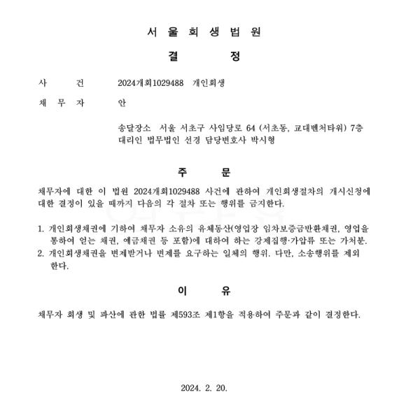 개인회생신청사건의 금지명령결정문