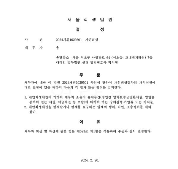 개인회생신청사건의 금지명령결정문