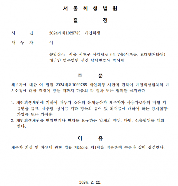 개인회생신청사건의 금지명령결정문