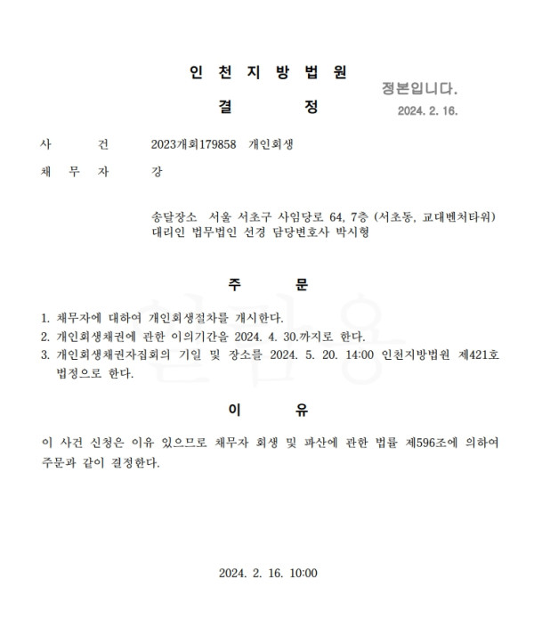 개인회생신청사건의 개시결정문