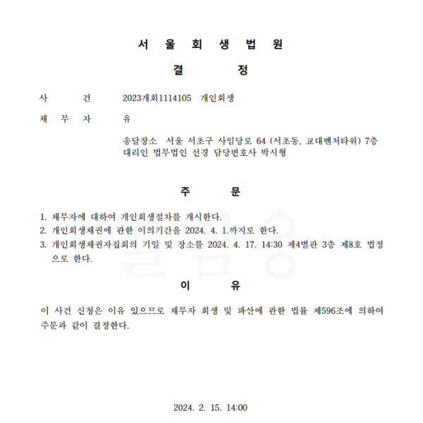 개인회생신청사건의 개시결정문