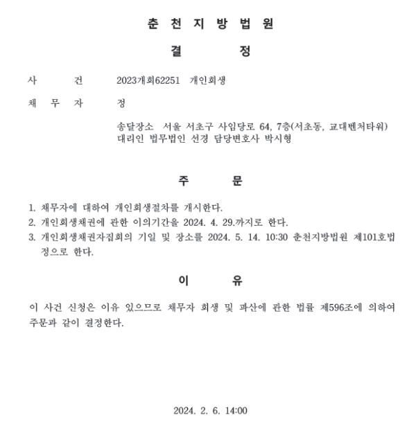 개인회생신청사건의 개시결정문