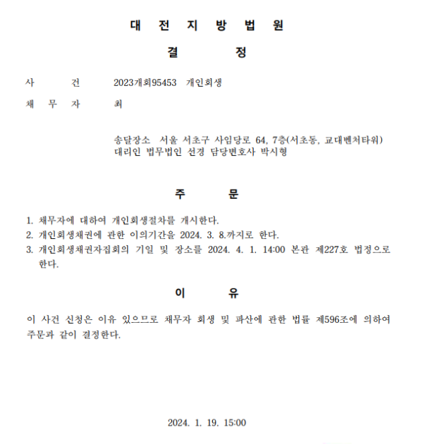 개인회생신청사건의 개시결정문