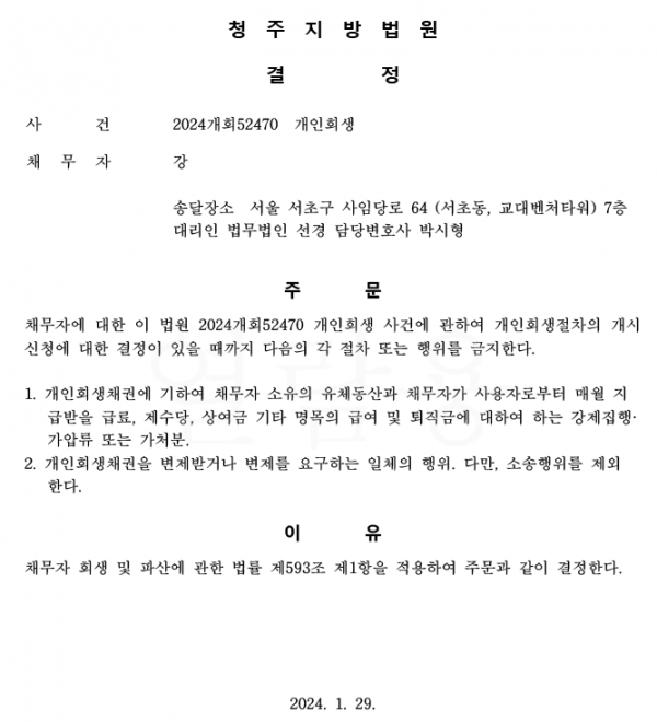 개인회생신청사건의 금지명령결정문