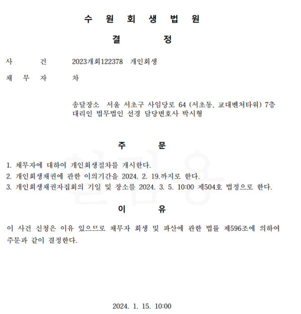 개인회생신청사건의 개시결정문