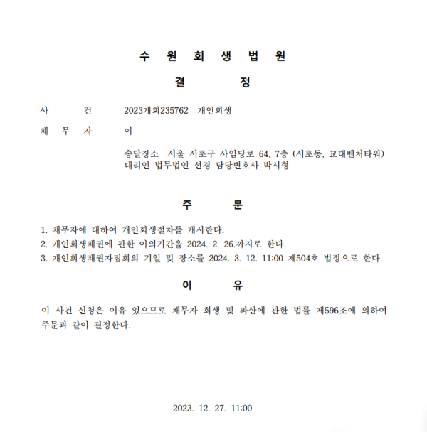 개인회생신청사건의 개시결정문